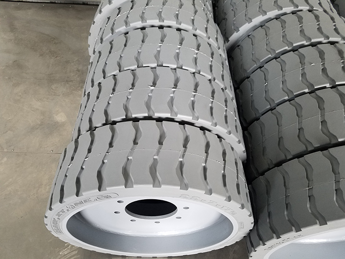 然后用吊带或叉车安全地将实心轮胎套装至轮毅,检查确保轮钢和轮毅装配贴实,装入螺母到螺栓头部,然后用8-10公斤风炮机或气动冲板手预拧紧到硬接触,使用8-10公斤,风炮机或扭矩板手顺时针、交错、对称分多次次拧紧轮毂螺母,直至全部达到力矩标准,用扭矩检测板手检测母拧紧力矩,要求为350Nm~370N,在轮栓交螺母及螺母接触位划标记线,示意已装妥将工具、工装归位
